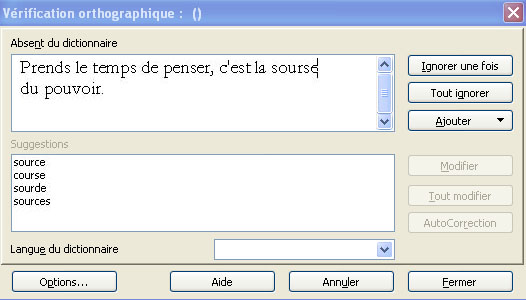 - Un clic dans le menu Outils ---> Grammaire et orthographe Les corrections possibles apparaissent les unes après les autres. Choisir Modifier pour appliquer une correction et Ignorer une fois pour ne pas corriger le texte. ATTENTION : ne cliquez pas sur Tout modifier . L'ordinateur choisirait pour vous la correction à adopter. L'ordinateur n'a pas toujours la bonne solution et il pourrait lui-même générer des erreurs.