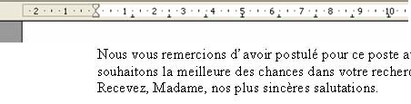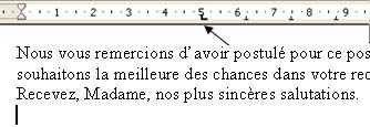 Positionnez vous devant le texte où vous voulez insérer une tabulation puis Exemple avec le texte suivant : ![]() Vous souhaitez que la phrase "Nous vous remercions..." commence à 5cm du bord gauche de la feuille. Cliquez directement dans la règle sur le chiffre 5 pour positionner le symbole "tabulation gauche" ![]() ![]() Puis positionnez le point d'insertion devant "Nous vous...." et enfin pressez la touche ![]()